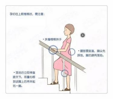 上下楼梯孕妇要特别注意:孕妇上楼梯要注意骨盆稍稍向前倾,抬起上半身,肩膀稍向后落下,下腭内敛,挺胸收臀,腹部突出,以保持整个身体的平衡。按照先脚尖、后脚跟的顺序,把整只脚放在台阶上,只用脚尖是很危险的,同时挺直腰部,将重心前移,用后脚向前推进。孕妇上楼梯时要看清台阶,每一步都走稳,最好扶着栏杆行走,以免发生意外