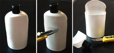 第二步:讲塑料瓶切开一面,削去半边,留出一个靠背,如图,使用美工刀的时候一定要注意安全哦!