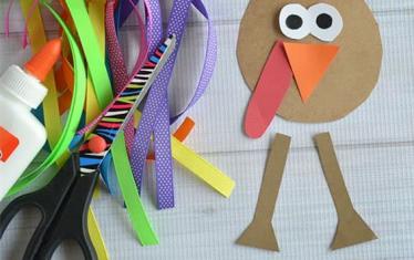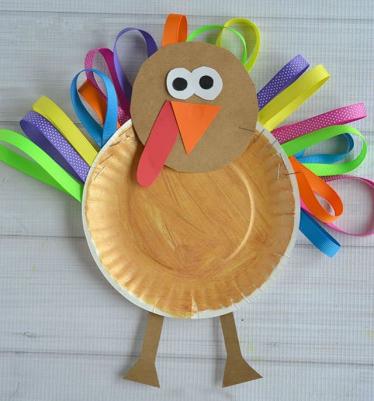 第四步:将牛皮纸剪出一块圆,然后在彩纸上分别剪出火鸡的嘴巴眼睛等,然后将其组合贴在纸盘正面靠上的位置即可。
