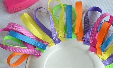 第三步:将彩带两端合拢定在纸盘的背面,呈扇形订好,多一些会更漂亮。