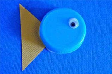 第二步:将三角形固定在瓶盖的下面,稍稍重叠,如图,在瓶盖靠前的位置贴上一个鱼眼。