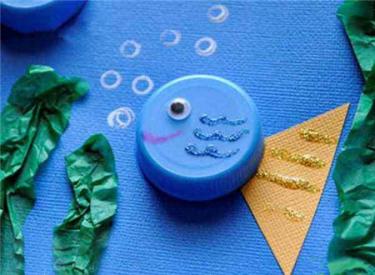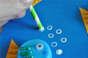 第四步:将小鱼多按照以上步骤做出来,然后固定在一张蓝色卡纸上,然后用废弃笔筒或吸管沾取一点白色颜料,按压在蓝色卡纸上,注意白色的小泡泡要集中在小鱼的嘴巴上方。