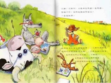 作者在书中,还传达一个观念,那就是阅读是可以分享的,虽然自个儿读书有其怡然自得的乐趣,不过,如果能念出来、说出来、演出来,与大家分享同乐,那更是一件喜上加喜的事情。书的后页图画,大野狼与小鸭、小猪和小母牛走出农场,到世界,为大家讲故事,彻底实现“独乐乐,不如众乐乐”的共享情怀。