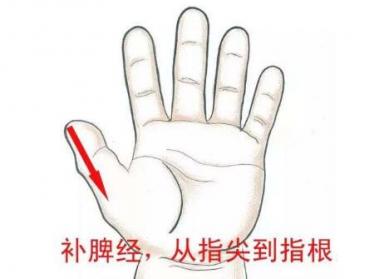 位置:脾经位于拇指桡侧缘(外侧),赤白肉际处。