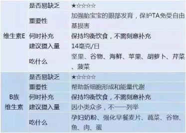 维生素B群: 它饮食了维生素B1、B2、B6、B12及烟酸,这些物质有助于神经的生长、视力、皮肤、糖类转化成能量等,因此是十分重要的。缺乏时则可能造成胎儿先天性脚气病、脑神经管缺损、神经系统发育异常,母亲方面则有脚气病、神经炎、癞皮病、肝脏损害和黄疸等危险。