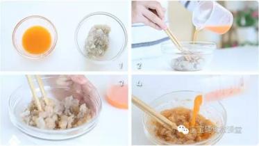 1-胡萝卜汁混合虾泥搅拌时,要分次且慢慢的倒入,边倒边搅拌,搅拌均匀后的状态是发粘且颜色均匀的就可以了。