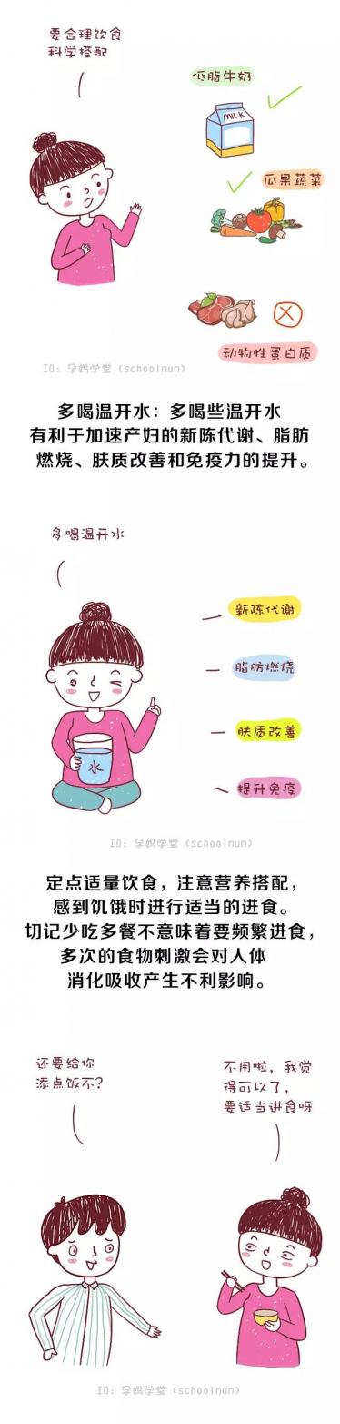 产后饮食的总体原则就是少食多餐、均衡饮食,保证营养但控制热量。避免摄入高热量食物,多喝温开水,保证饮食清淡,多食用瓜果蔬菜,少食鱼、肉及动物性蛋白质。少吃多餐,定点适量饮食,注意营养搭配。