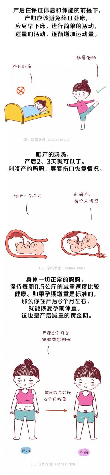 通常来讲,自然分娩的妈妈在产后2到3天就可以下床走动,3到5天后就可做一些收缩骨盆的运动;产后两个星期,就可以做柔软体操或伸展运动。若顺产但有产后大出血的情况,妈妈需要视身体的情况而定。